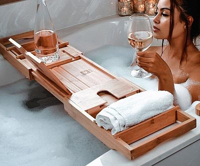 She can go from bed to the bath back to bed again with a convertible table designed for relaxing in the tub and enjoying breakfast. The bamboo table can expand to fit any tub and has room for a wine glass, table, towel, candle, and more. When she’s done bathing, she can fold down legs and dine on the table.