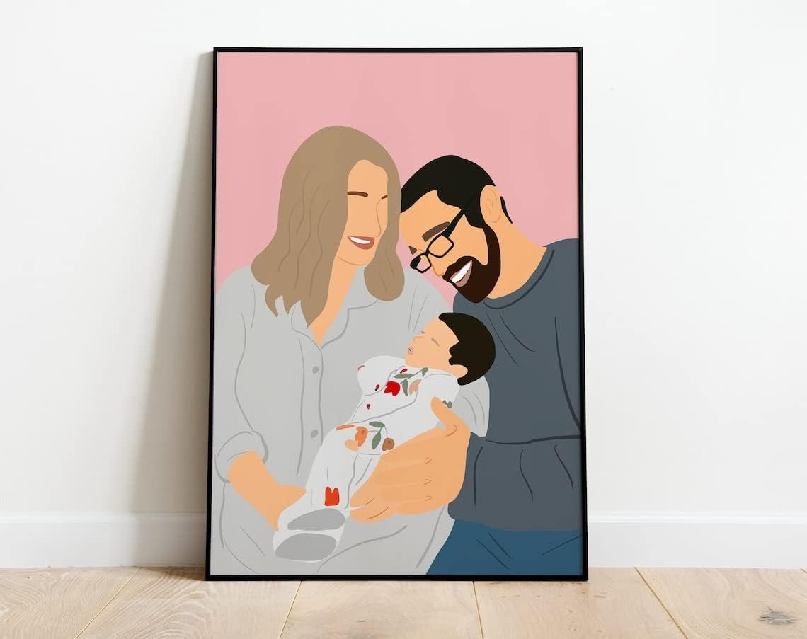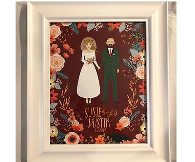 Couples that love to blend all things vintage with all things modern will love this custom wedding portrait. An illustration of the couple is surrounded by a pretty retro floral pattern. The piece is completed with their names and your choice of background color. There are 5 sizes available and you can add a dog!