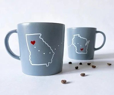 You can be thousands of miles apart, but when you’re both drinking from this customized long-distance love mug set, you’ll feel like you’re having breakfast together. Each of the handmade ceramic mugs is adorned with your respective locations with a little heart over where each of you lives.