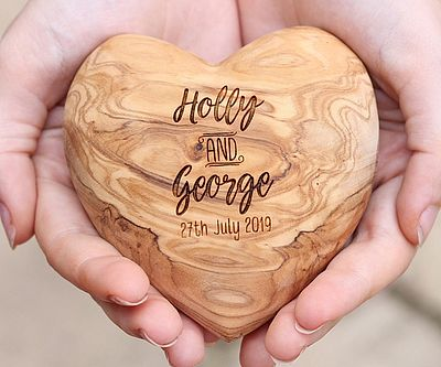 Give her a heart she can actually hold in her hands with this engraved token of your affection. The piece is carefully carved and sanded from a piece of real olive wood, so it has a silky smooth finish. You r names and the date of your anniversary are engraved in its surface to complete its look.