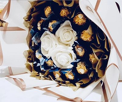 Forget roses, give your sister what she really wants as a bouquet, gourmet chocolate! There are 15 or 16 chocolates in the bunch depending on the option you choose along with three faux roses at the center in white, red, or pink.