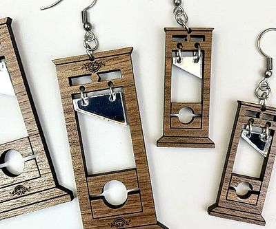 Let your macabre side shine through with these attention-grabbing guillotine dangle earrings. These peculiar earrings styled like pint-size guillotines come in two sizes and can be further customized in one of nine different finishes.