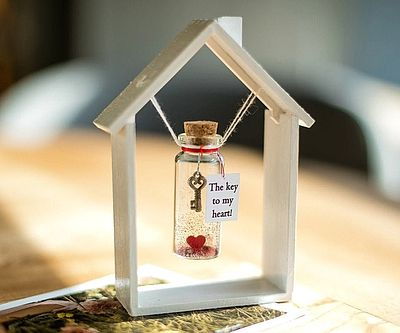 There’s no more important key to have than the key to one’s heart. Show your sweetie just how much of an impact she’s made on your life with this heartwarming token. Floating in the center of the house is a little glass jar filled with a petite key that represents a lifetime of love.