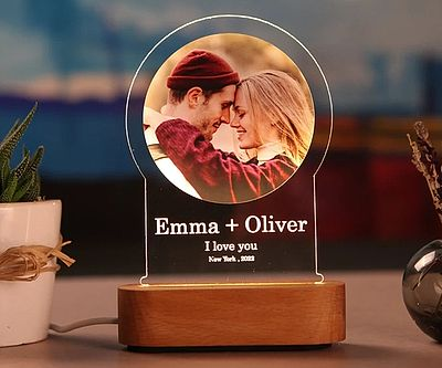 Light up your lady’s night with a nightlight that’ll warm her heart and her room’s ambiance. This acrylic lamp is printed with a photo of the two of you and engraved with details about your relationship. It sits on an LED light that catches the acrylic engraving and makes it pop as it bathes the room in a warm glow.