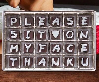 If life is like a box of chocolates, when you give your GF this naughty box, life is about to get a lot more fun. When she’s done chowing down on the hilarious homemade chocolate and you’re done tossing her salad, she’ll probably be down to gobble something else…