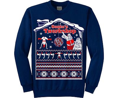Keep the naughty boy or girl on your list warm in style with a Santa’s Twerkshop Christmas sweater. This cotton crewneck is available in four color options and is screen-printed with a gut-busting image of Santa getting down at his Twerkshop.