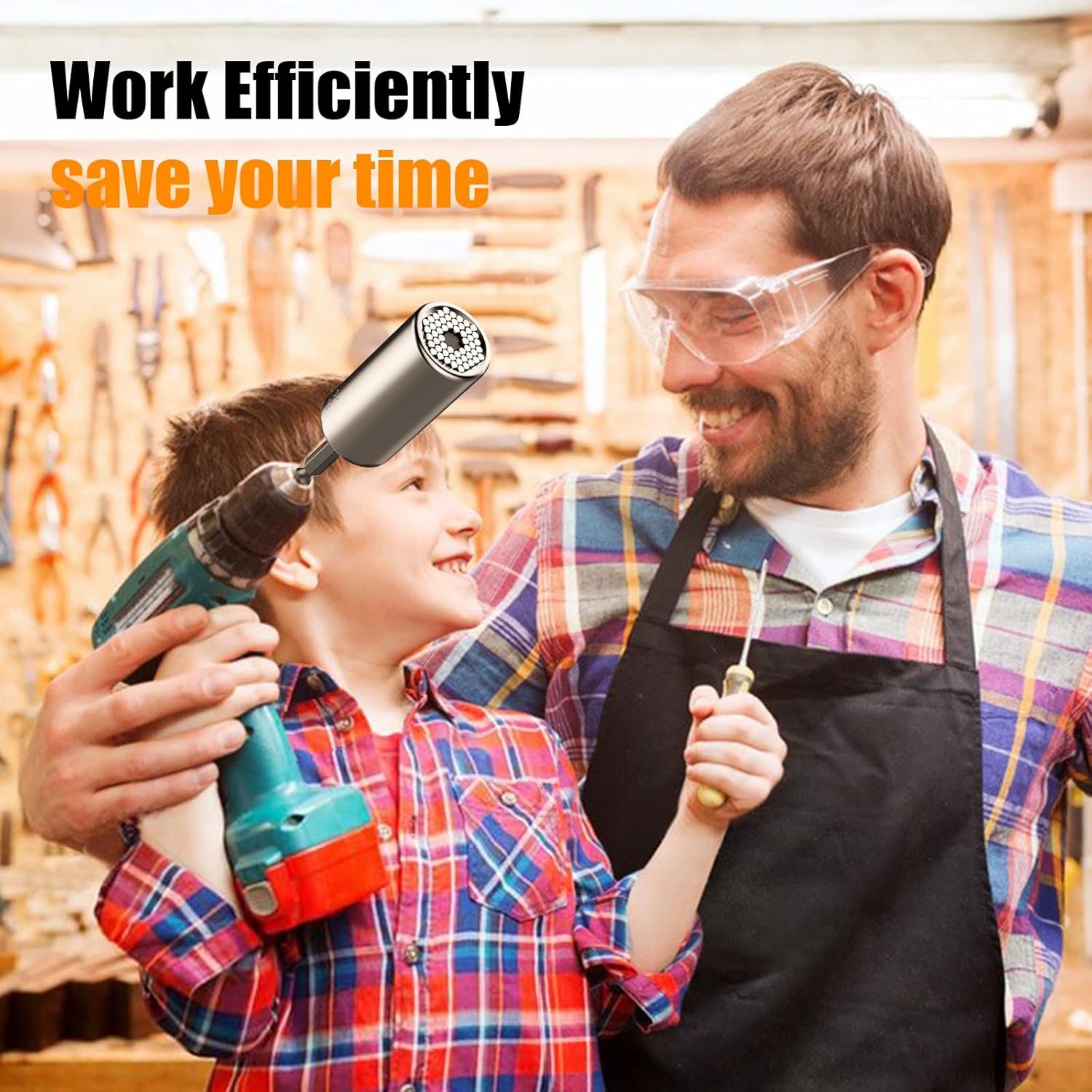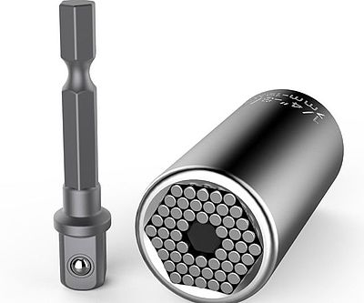 Reduce the clutter in your toolbox by replacing a slew of sockets with the universal socket. This power drill compatible socket features a sturdy stainless steel construction in addition to 54 retractable hardened pins to accommodate sizes between 7mm to 19mm.