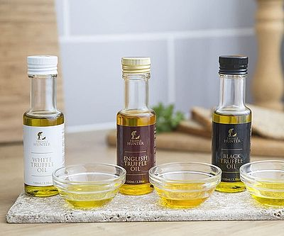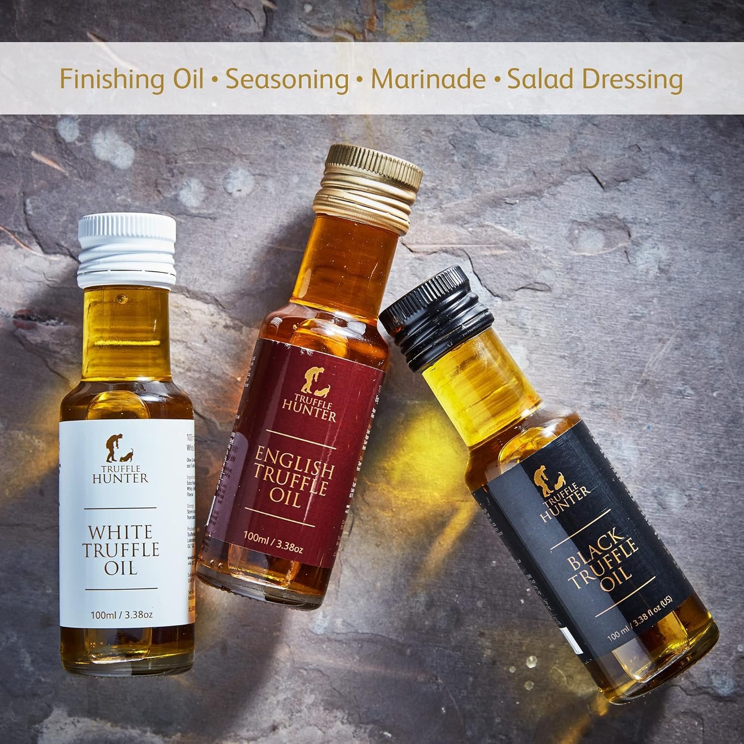 “Black Truffle Oil: Extra Virgin Olive Oil, Olive Oil, Black Truffles, Black Truffle flavoring White Truffle Oil: Extra Virgin Olive Oil, Olive Oil, White Truffles, White Truffle flavoring English Truffle Oil: Cold Pressed Extra Virgin Rapeseed Oil, English Black Truffles, Black Truffle flavoring”