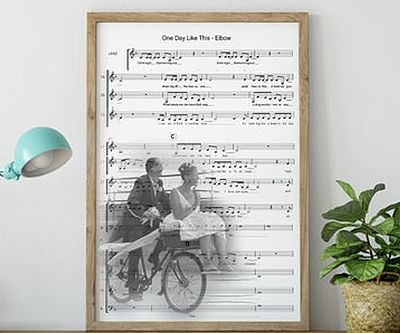Give a music-loving couple a sweet and sentimental reminder of their first dance with this gorgeous customized first sone sheet music print. The art is available in an A3 or A4 size and features the first page of the sheet music of their song with an overlay of a picture of the couple.