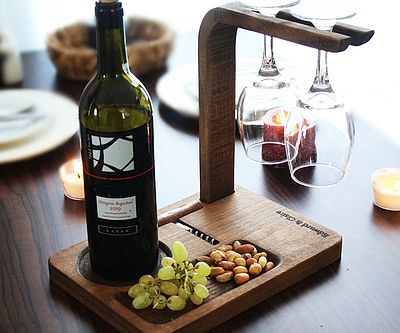 Take an evening to have a picnic for two with a cheeseboard and wine stand that really makes an evening romantic. This one is personalized with your names and expertly crafted with an arm to hold glasses, compartments for food, and a bottle opener built in.
